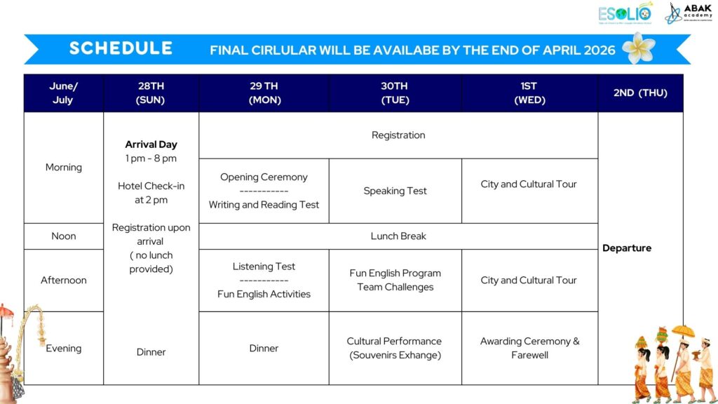The English for Speakers of Other Languages International Olympiad (ESOLIO) is an annual global competition designed to promote excellence in English language proficiency among non-native speakers. The 2025 edition will be held in Bali, Indonesia, from 28th June - 2nd July 2026, bringing together talented students from around the world to compete in a series of challenges that test their listening, reading, writing, and speaking skills.